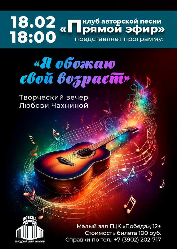 Клуб «Прямой эфир» приглашает любителей жанра авторской песни на творческий вечер Любови Чахниной. Эта участница клуба большая умелица в исполнении юмористических песен и иронического романса. Но будьте уверены, что вы узнаете ее и как мастера – искреннего, глубокого, мыслящего...