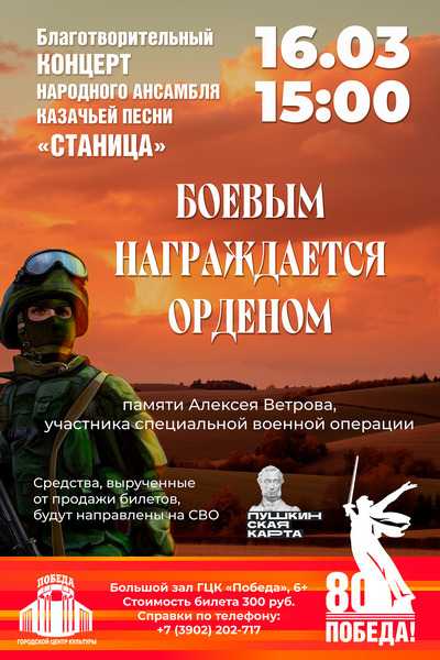 В рамках Года защитника Отечества и поддержки участников СВО состоится концерт народного ансамбля казачьей песни «Станица», посвященный памяти участника специальной военной операции Алексея Ветрова. Алексей был не только отважным солдатом, который ценой своей жизни спас целый взвод, но и талантливым участником ансамбля «Станица».