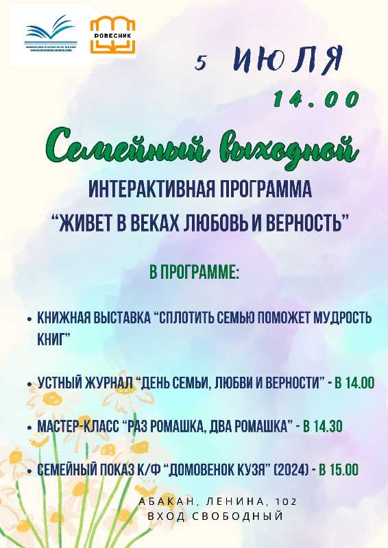 Программа обещает быть насыщенной. Вместе мы узнаем об истории праздника, познакомимся с книгами, на чьих страницах царит атмосфера любви и преданности, своими ручками создадим ромашку - символ праздника, а после дружно окунемся в сказочный мир фильма "Домовенок Кузя".