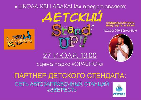 Проект предназначен для юных талантов в возрасте от 8 до 17 лет. Организаторы просят ребят заявить о своём участии в детском стендапе и позвонить главному редактору Абаканской лиги КВН Алексею Ахпашеву по телефону – 8 (913) 563-55-53.