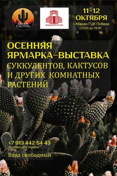Приглашаем на осеннюю ярмарку-выставку кактусов, суккулентов и других комнатных растений «GREEN CACTUS». Каждый гость ярмарки сможет подобрать комнатное растение или композицию из суккулентов, получить инструкцию по их выращиванию. На ярмарке можно будет приобрести кашпо ручной работы, грунт и другие предметы для ухода за растениями. Также будет работать беспроигрышная лотерея и стол с растениями, которые посетители смогут забрать даром.