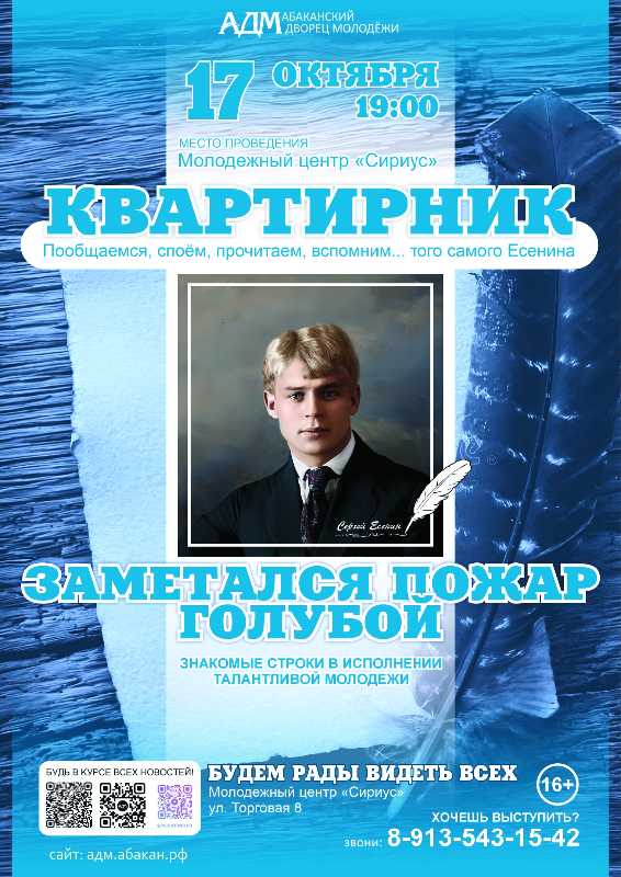 Всех любителей гитары, творчества Есенина С. А. Молодежный центр Абаканского Дворца Молодёжи приглашает на квартирник! Безопасная, творческая атмосфера и много новых знакомств!