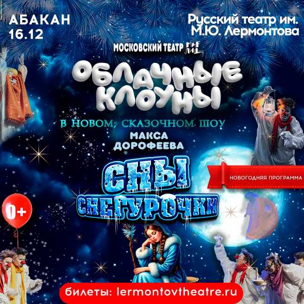 Московский Театр «Мир Лиц» представляет шоу «Облачные клоуны» – с новой, сказочной программой «Сны Снегурочки», невероятную историю, которая погрузит вас в детство, подарит радость, смех и волшебство!