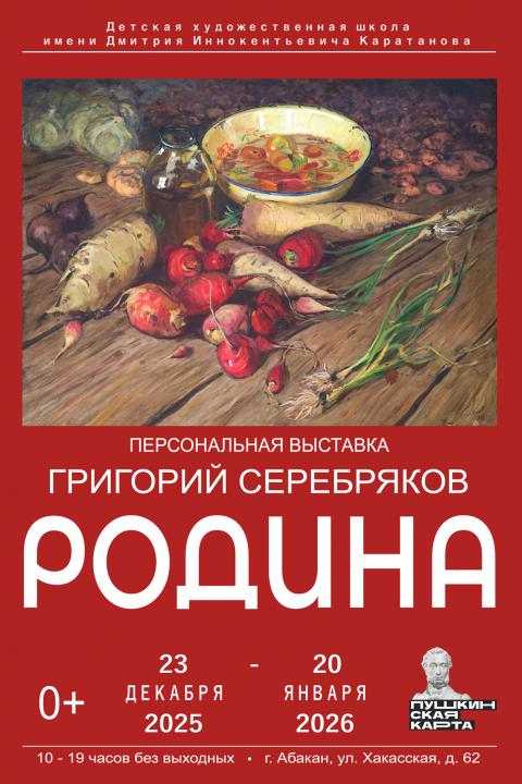 Выставка «Родина» представляет собрание произведений Г.А. Серебрякова из фонда Абаканской картинной галереи имени Ф.Е. Пронских. Коллекция состоит из более чем 70 работ. Все они являются лучшими в уникальном собрании живописца, члена Союза художников России, Заслуженного работника культуры Республики Хакасия Григория Серебрякова.