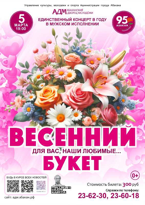 Милые дамы, приходите на концерт "Весенний букет" и позвольте нам сделать ваш вечер по-настоящему незабываемым! Как всегда, на сцене – мужские таланты, а в зрительном зале – женская красота и восхищение.