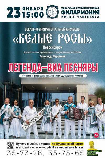 Песни ансамбля «Песняры» знакомы и любимы людьми разных поколений. Практически все песни – хиты! В Абакане прозвучат знакомые слушателям «Белорусия», «Вологда», «Березовый сок», «Беловежская пуща», «Я не могу иначе», «Олеся» и многие другие популярные песни.