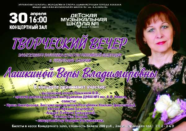 Зрителя ждет встреча с детским оркестром русских народных инструментов ДМШ№1 имени А.А.Кенеля, которым Лашкина Вера Владимировна руководит долгие годы, а так же солистами - Заслуженной артисткой Республики Хакасия Ириной Никифоровой (фортепиано), Евгенией Пак (вокал), Евгением Кряжевым (ксилофон), Андреем Любягиным (аккордеон) .
