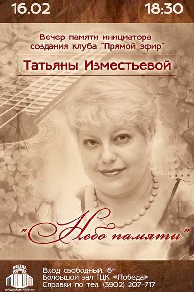 В этот вечер на сцене выступят участники клубов "Прямой эфир" и "Соло", коллеги из ГТРК «Хакасия», друзья, однокурсники и все, кто помнит и любит Татьяну. Гости мероприятия смогут увидеть гитару Татьяны Юрьевны, посмотреть небольшой фильм о Татьяне и вспомнить лучшие моменты жизни и творчества.