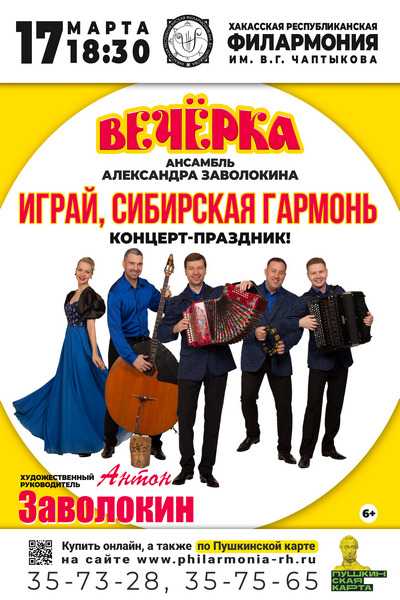 Концерт легендарного ансамбля одного из родоначальников телепередачи «Играй, гармонь!», заслуженного артиста России Александра Заволокина. Художественный руководитель ансамбля «Вечёрка» - Антон Заволокин.