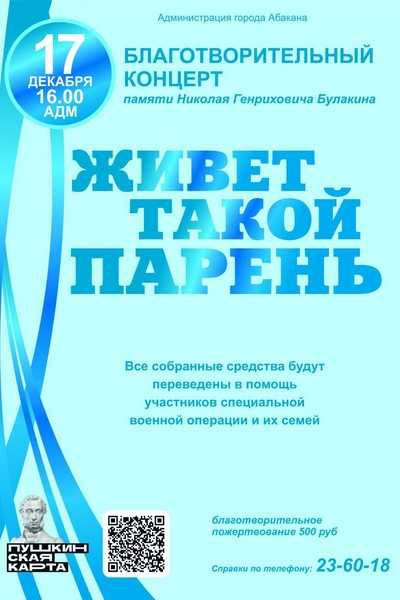 Концерт называется «Живёт такой парень». Творец и опора семьи, мастер и наставник, отец, друг, настоящий мужчина… Тот, кто даёт возможность увидеть мир панорамно, а не через маленькое подслеповатое окошечко. Именно такие люди оставляют след в душе и объединяют, именно о таких мы вспоминаем чаще всего и такими людьми гордимся. Наверное, в том числе именно поэтому на сцену АДМ выйдут лучшие артисты и творческие коллективы Абакана. Те, кто создают поэзию, музыку и ритм нашего города.Друзья, приобретайте билеты и приходите на концерт дарить добро, а мы будем вас радовать и удивлять.