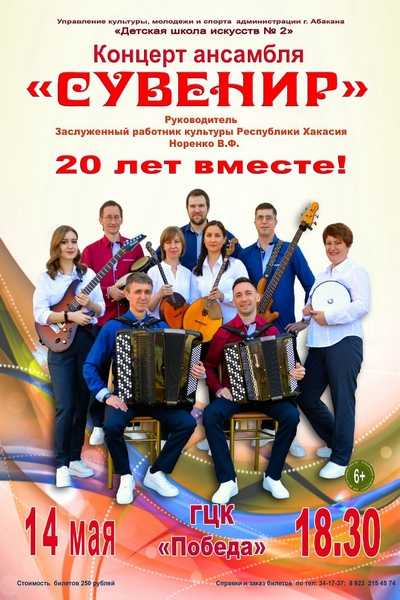 Ансамбль преподавателей Детской школы искусств №2 г. Абакана «Сувенир» под руководством Заслуженного работника культуры республики Хакасия Владимира Норенко отмечает юбилей и представляет концертную программу «Юбилей – 20 лет»!
