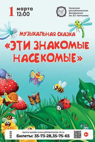 В музыкальной сказке «Эти знакомые насекомые» юные зрители вместе со сказочной Феей познакомятся с миром насекомых. Бабочка, Стрекоза, Жук-Дровосек, Серенада-Цикада, Божья Коровка, Пчела и Светлячок в исполнении солистов Хакасской республиканской филармонии придут в гости к зрителям и исполнят для них замечательные песенки.