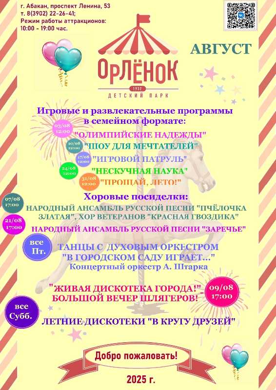 Большой вечер шлягеров «Живая Дискотека Города!». Вас ждут выступления лучших вокалистов из трёх городов: Абакана, Минусинска и Саяногорска. Это незабываемый праздник музыки, радости и хорошего настроения. Начнём зажигать ровно в 17:00!