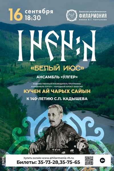 В исполнении ансамбля «Ӱлгер» прозвучат фольклорные песни и отрывки из героических сказаний Семёна Прокопьевича Кадышева - крупнейшего представителя носителей хакасского фольклора. Выступление состоится в рамках празднования 140-летия со дня рождения С.П. Кадышева.
