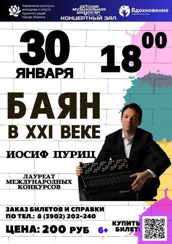 Иосиф Пуриц—один из ярких представителей молодого поколения баянистов, лауреат более тридцати международных конкурсов, музыкант—выступавший на самых престижных концертных площадках мира, основатель и активный участник различных творческих коллективов.В исполнении музыканта прозвучат произведения классической и современной направленности. Концерт обещает быть интересным и очень неординарным.