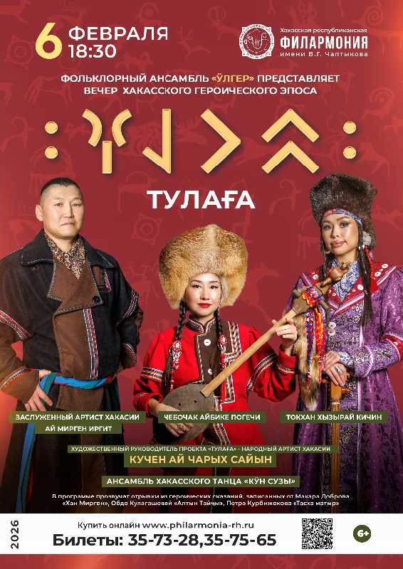 - В программе «Тулаға» будут показаны разные виды исполнения эпоса: без инструментов, на двухструнном и трёхструнном хомысе, ыыхе, а также на чатхане с использованием горлового пения хай и речитативной декламации, - отметил художественный руководитель ансамбля «Ӱлгер» Кучен Ай Чарых Сайын.