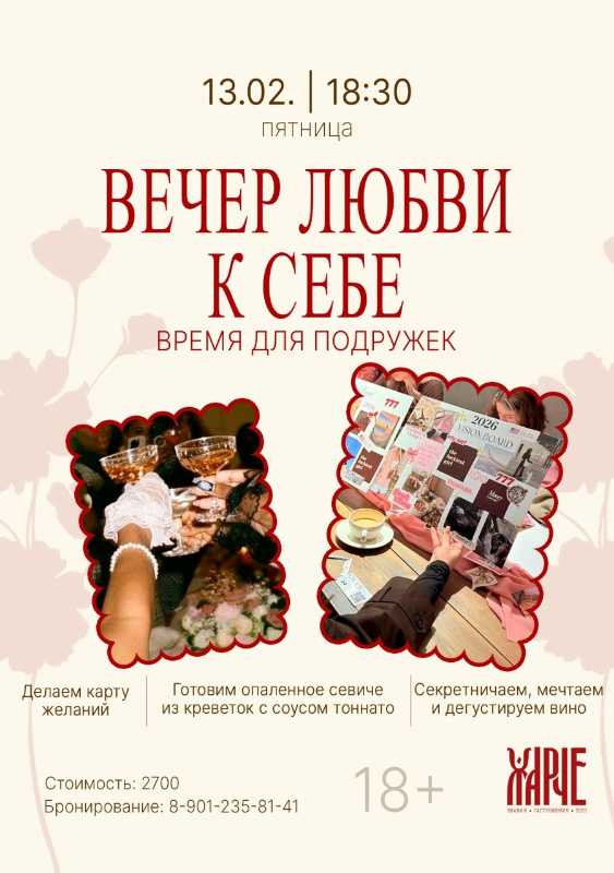 Остановиться, выдохнуть, собраться с подругами и позволить себе вечер без ожиданий. Приглашаем вас на «Вечер любви к себе» — тёплую встречу в камерной атмосфере, где внимание направлено внутрь, а рядом — только свои.